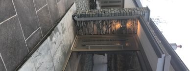 Entrance porch including aluminium door, adjacent aluminium windows and powder coated aluminium corner pressing.