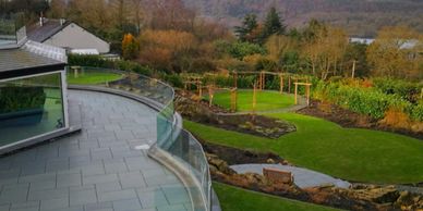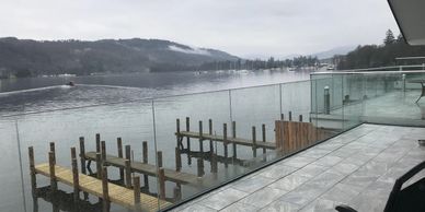 Supply and installation of facetted glass balustrade, around a 30m curved terrace over-looking the lake.