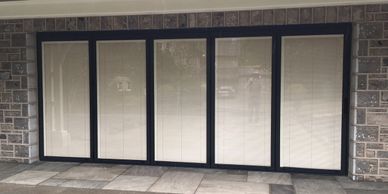 Supply and installation of low-threshold aluminium bifold doors with integrated blinds to a classic car showroom in Lancashire